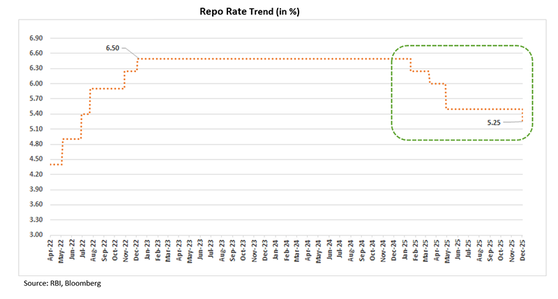 The RBI’s Monetary Policy Committee (MPC) unanimously cut the repo rate (the rate at which RBI lends to Banks) by 25 basis points, bringing it down from 5.50% to 5.25%. Cumulatively, RBI has cut 125 bps since Feb’25 so far. With most consumer loans including home loans are linked to the repo rate. This means the latest rate cut will pass through more quickly to borrowers, helping lower EMIs and support consumer demand.